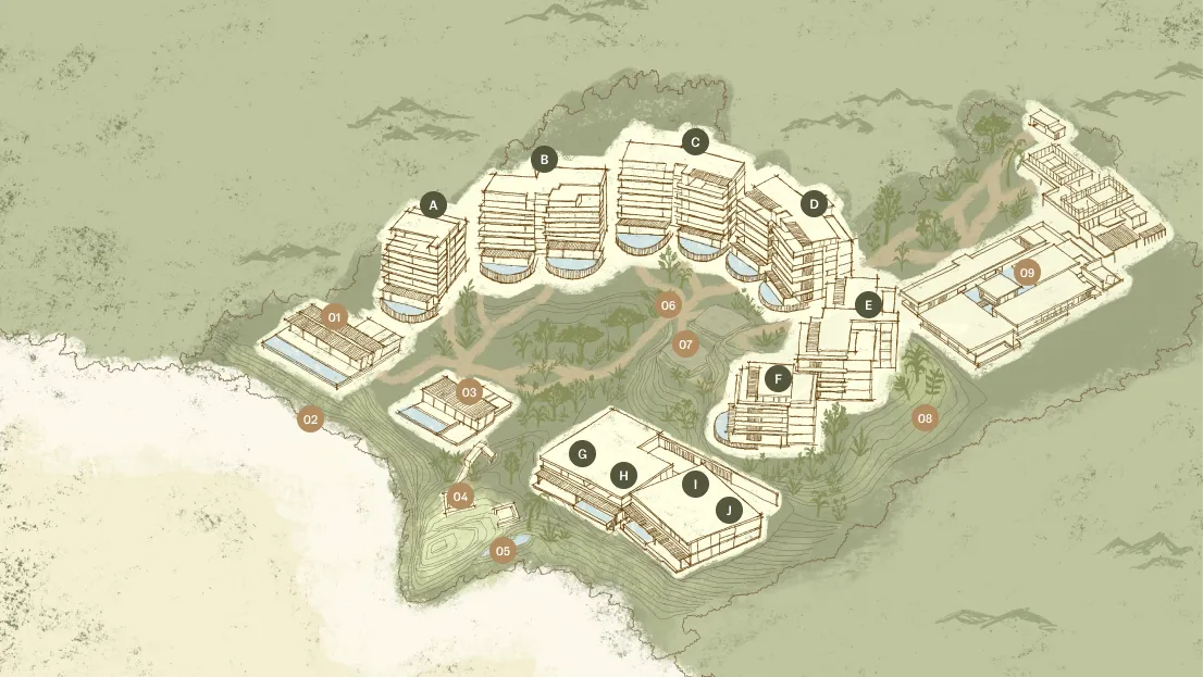 Low-density development with a private beach. Residences with 4 to 6 bedrooms and customizable villas with up to 7 bedrooms, all featuring direct ocean views.